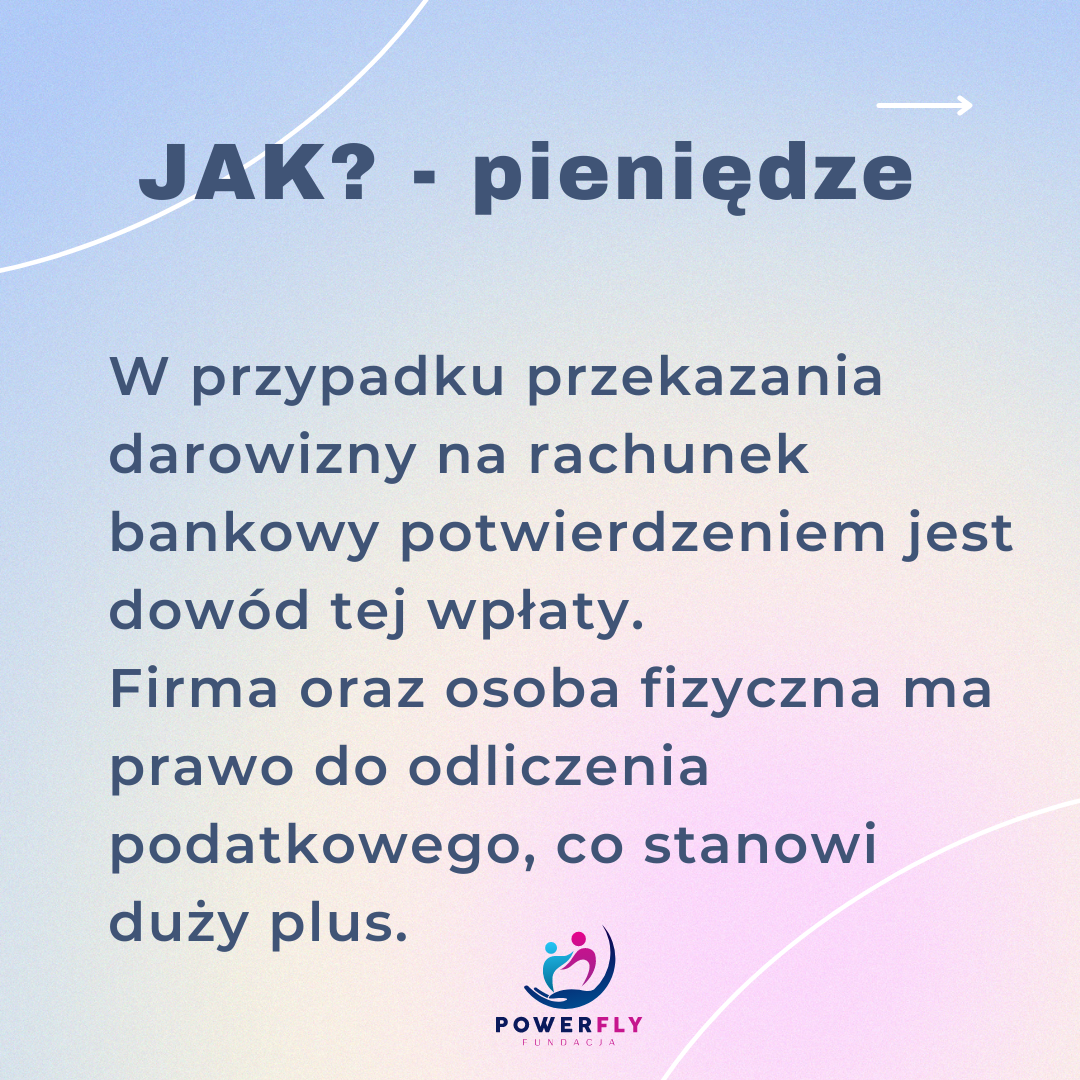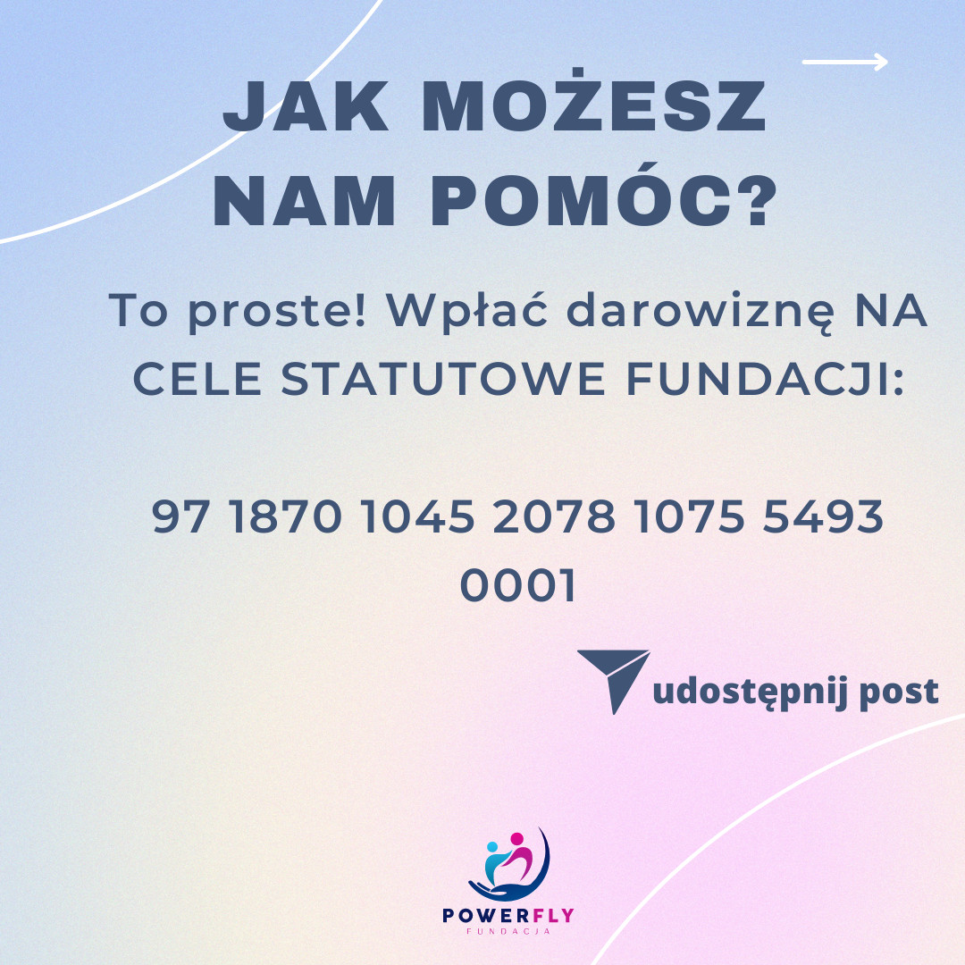 Wpłat można dokonać tradycyjnym przelewem na konto Fundacji Powerfly w Nest Banku: 97 1870 1045 2078 1075 5493 0001